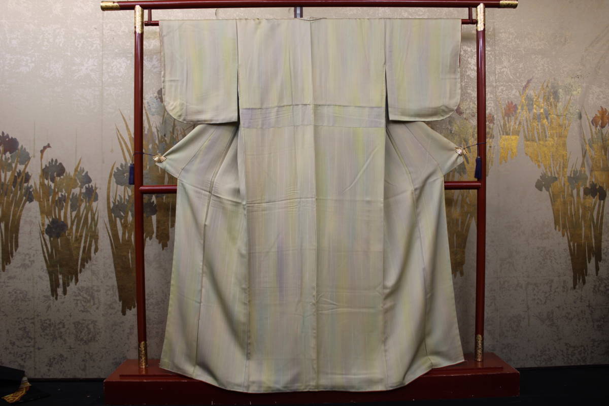 > きもの今昔4980 色無地調小紋のきもの 広衿袷手縫い仕立て 正絹梨地綸子地鶯色濃淡ぼかしに雨縞入り 身丈156cm