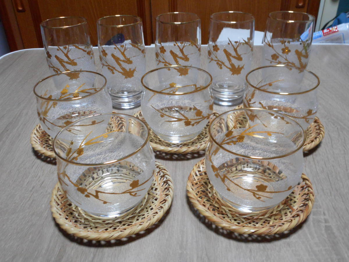 - 梅柄 冷茶グラス タンブラー 5客セット 茶托付き カメイガラス 長期保管品