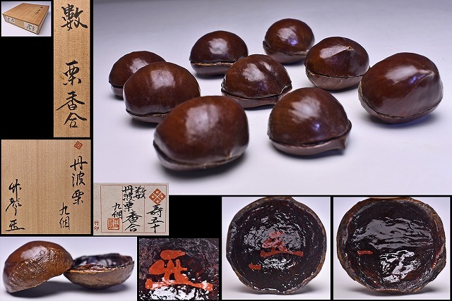 - 竹印 か★ 丹波栗 數 栗香合 9個 ★ 共箱 ★ 自然の栗を丁寧な仕事で仕上げた逸品 ★ 珍品 ★ 香道具 ★ それぞれに朱印あり