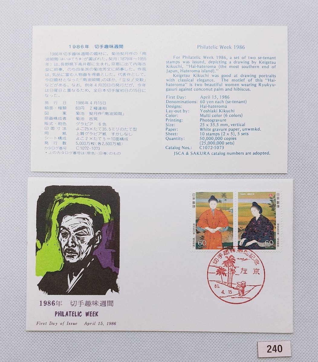 - FDC/ア/切手趣味週間/南波照間/初日印/左京風景印/JPS版/解説書有り/1986年4月15日/初日カバー №240