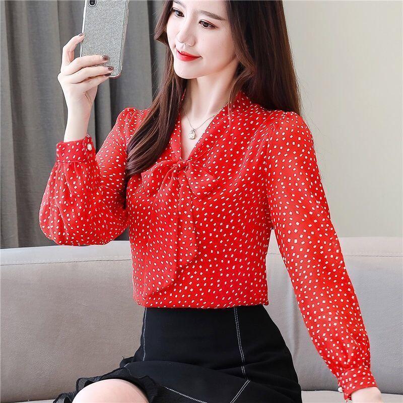 - 【レッドリボン★XLサイズ】レディース 長袖 シャツ ブラウス通勤 通学 就活