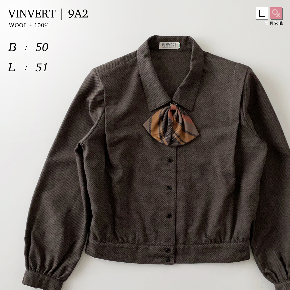 > VINVERT 薄手 ウール 100% シャツ ジャケット 茶色 ブラウン ショート丈 リボン 春 秋 カジュアル 襟付き 大きいサイズ バンベール L 11号