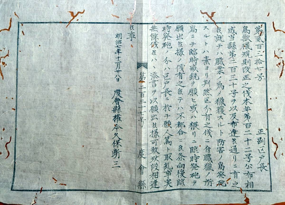 - f23051603〇明治布告布達 鳥獣猟規則改正 威銃を願い 度会県 三重県 明治6年〇和本古書古文書