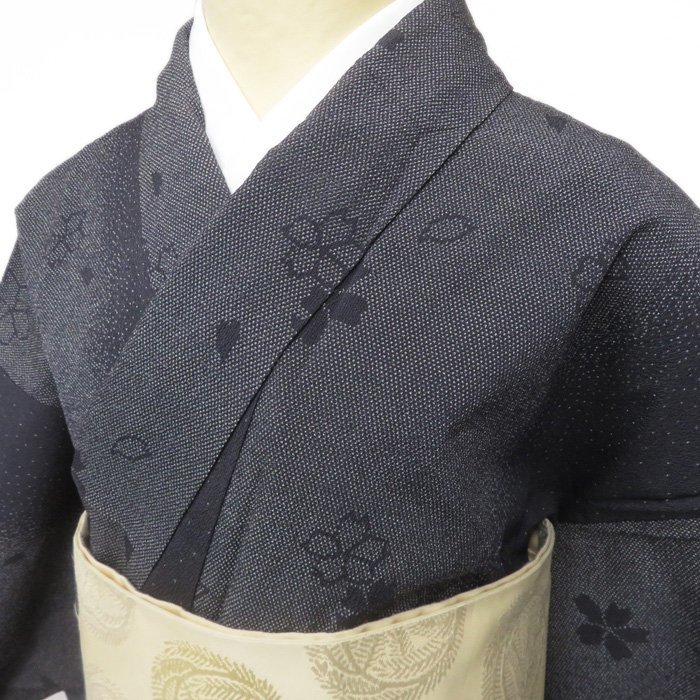 - ★きもの北條★ 単衣 着物 塩沢 お召 桜模様 凛とモダンな美の世界 ワイド 黒橡色 A719-3 L【中古】