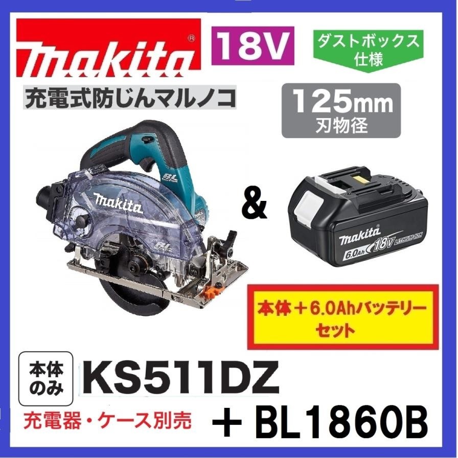 > マキタ 125mm 18V 充電式防じんマルノコ KS511DZ+バッテリ(BL1860B) [充電器・ケース別売]【日本国内・マキタ純正品・新品/未使用】