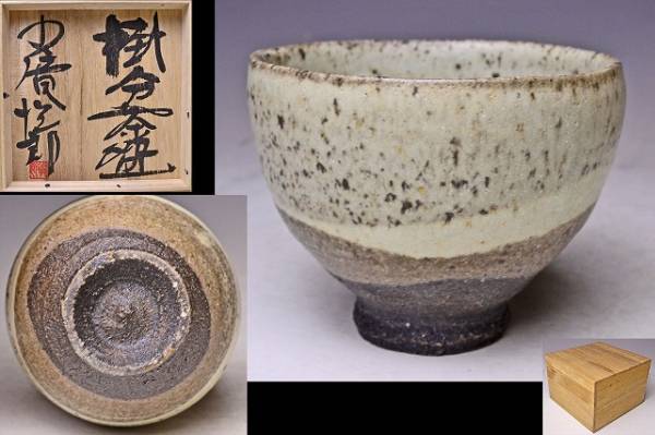 - 小瀧悦郎 ★ 灰釉掛分茶碗 ★ 共箱 ★ 希少 ! ★ 検 人間国宝 田村耕一 小滝
