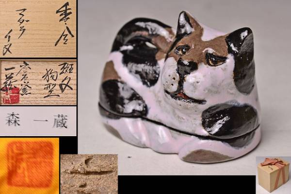 - 森一蔵 ★ 萬古 斑文 狗型 香合 ★ 共箱 共布 栞 ★師:日根野作三 ★ 氏らしい愛らしい表情の逸品 ★ 万古焼 三重県 ★