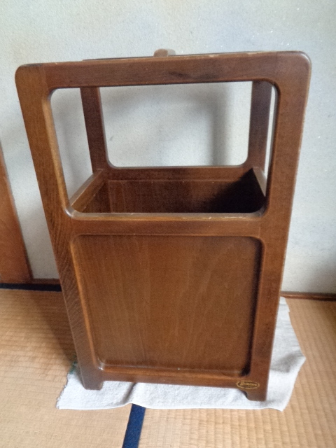 - アンティーク 昭和レトロ 木製 傘立て/SANKYU-MADE IN JAPAN/底受皿の錆び大・側面化粧板に糊ハガレの浮きあり/
