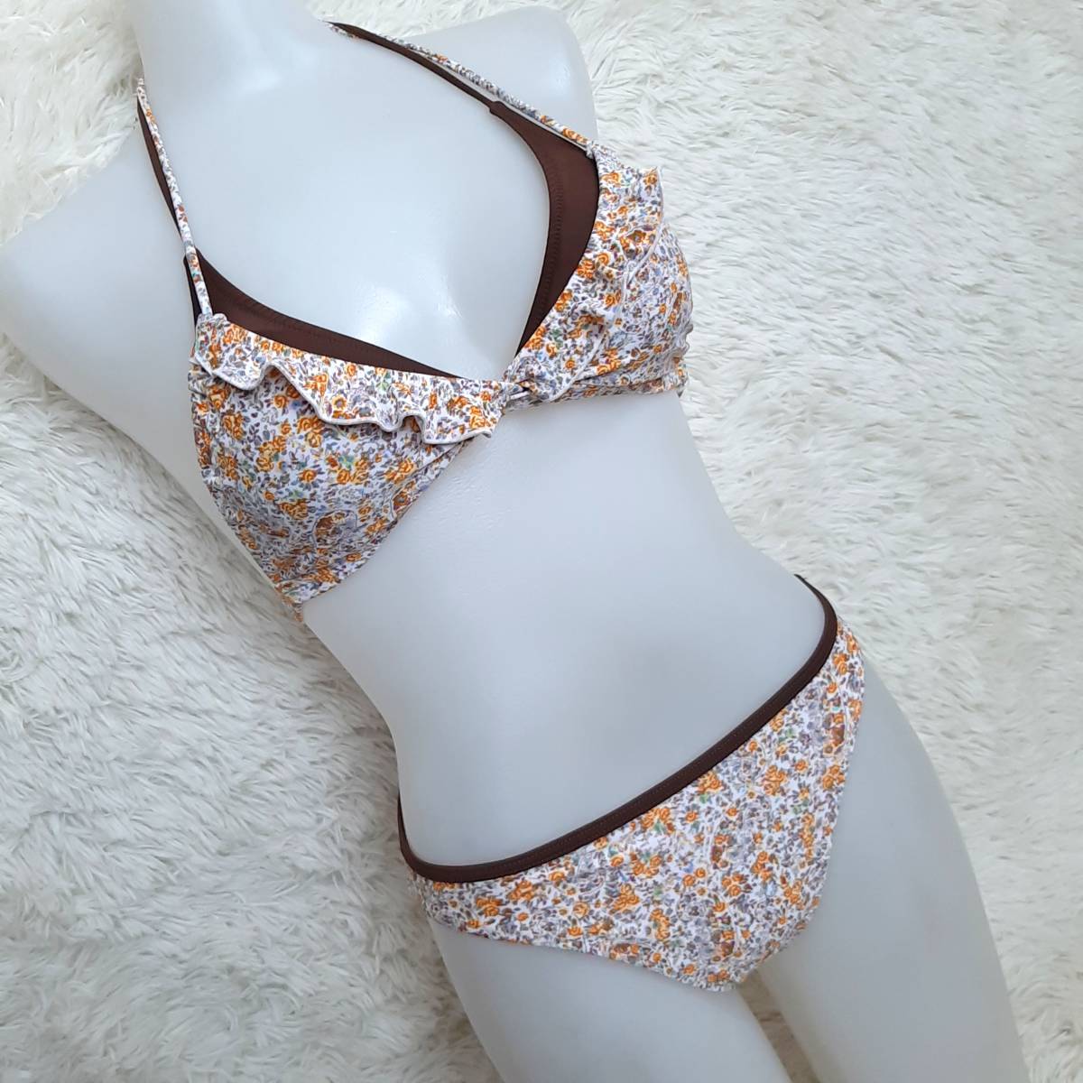 - 匿名配送★小花柄 2枚重ね フリル ホルターネック ビキニ 水着 ブラウン 9M オ