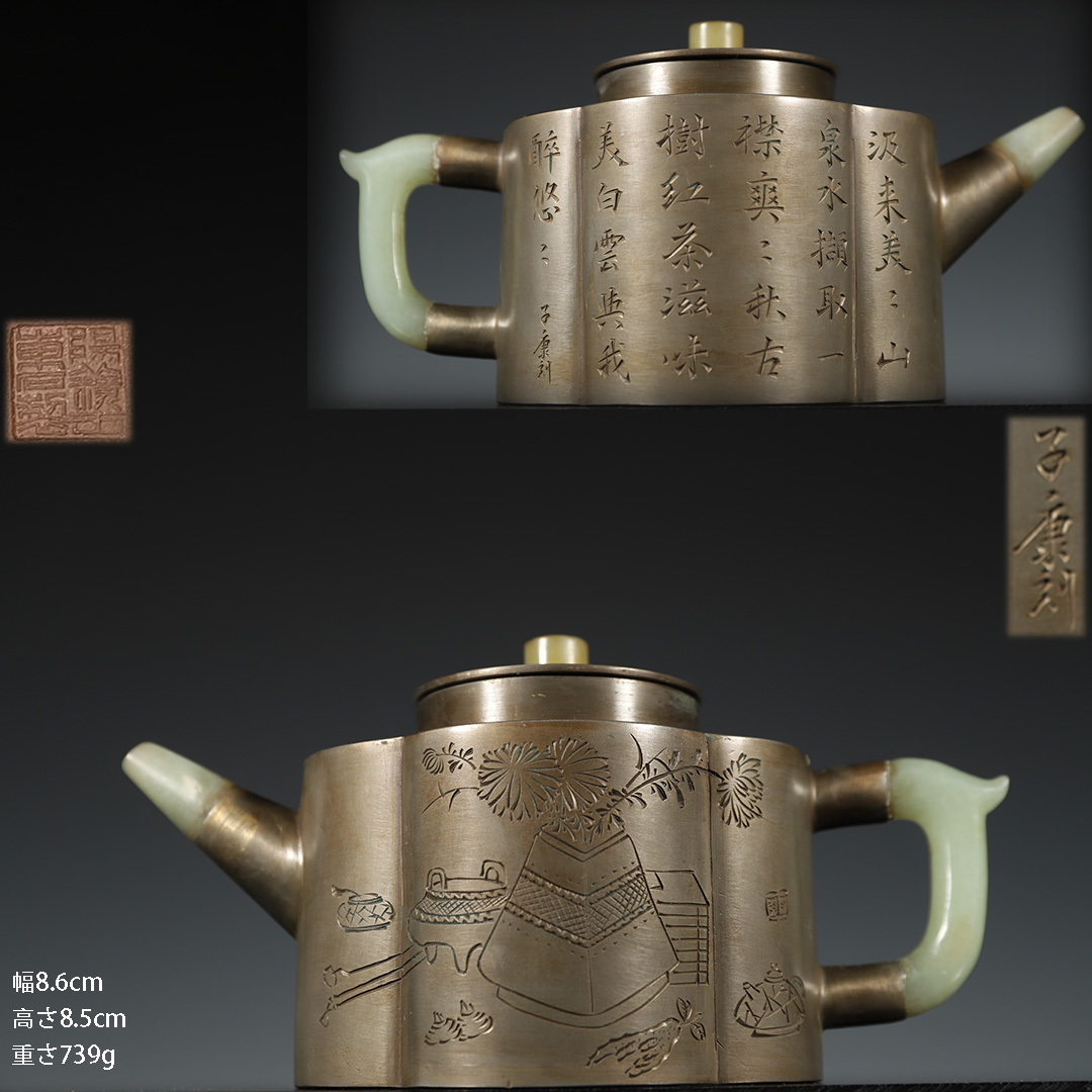- 古錫 茶壷 王東石製 「錫刻花卉詩文図三嵌玉文旦壷」 紫泥内堂 紫砂壷 煎茶 急須 茶道具 唐物 時代物 古陶芸 LT-07206