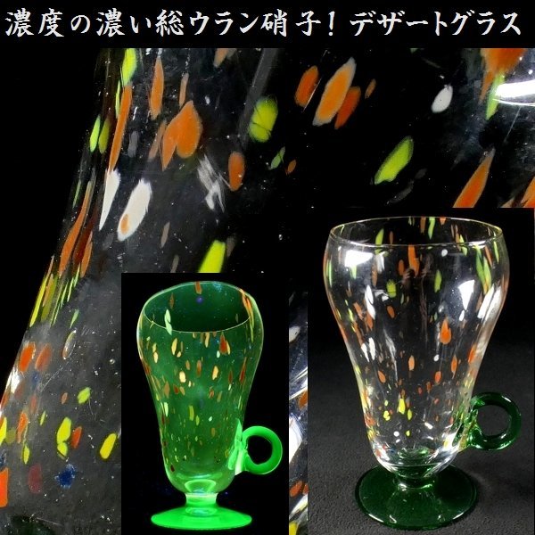 > 【 恵 #0704 】 ウラン硝子使用 アンティーク 水玉文様 氷コップ デザートグラス 検:鉢/古ガラス/氷コップ/色ガラス/硝子