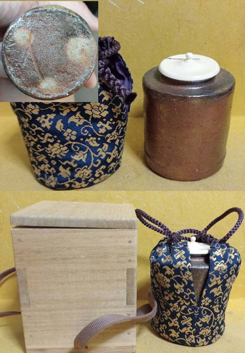 - 桃山時代 備前 茶入 窯印 仕覆 利休好み虫喰い蓋 箱 茶道具 桃山 志野焼 美濃焼 古志野 美濃 古織部