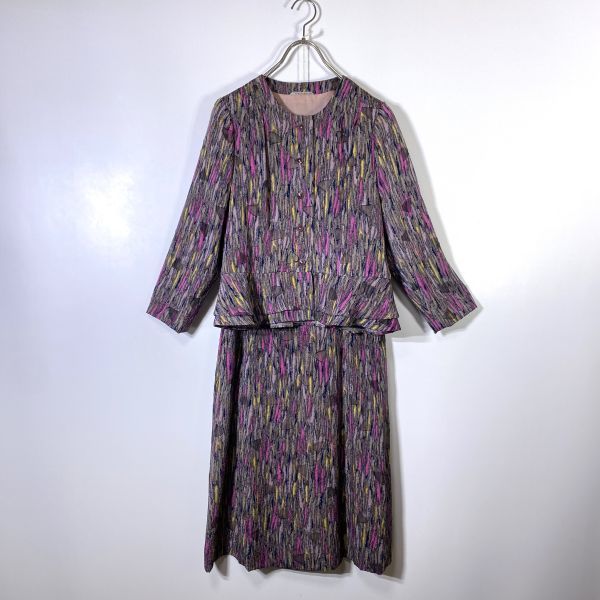 - 昭和レトロ オートクチュール オーダーメイド レディースM相当 セットアップ ツーピース ノーカラースーツ 長袖 総柄 ピンクグレー系
