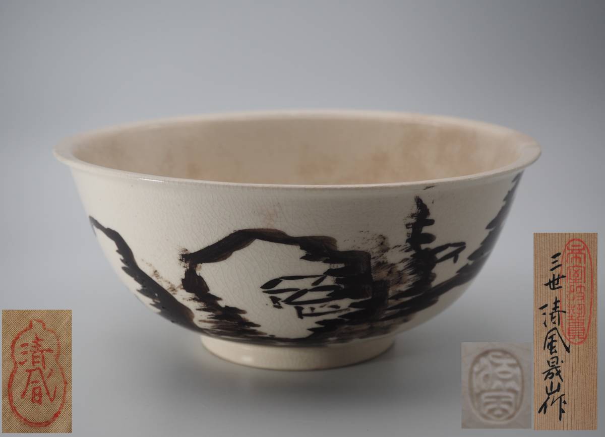 - 帝室技芸員判あり 三代清風与平造 陶製墨画 菓子器 共布/共箱