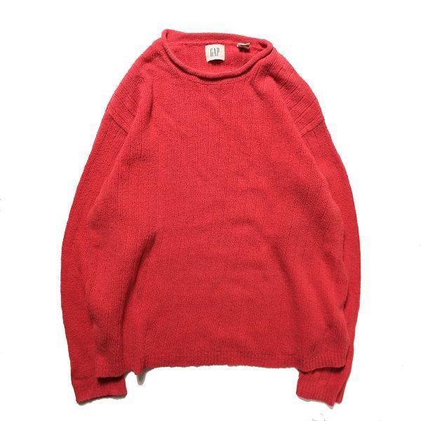 - 90's ギャップ GAP ロールネック コットン ニットセーター (M) 赤 ストライプ 針抜き 90年代 旧タグ オールド 白タグ Y2K