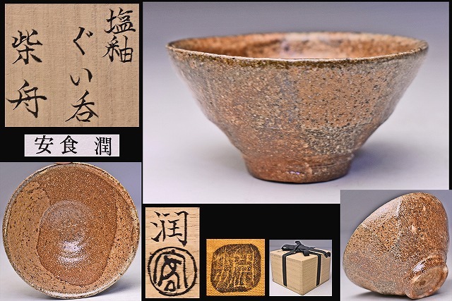 - 安食潤 ★ 塩釉 ぐい呑 紫舟 ★ 共箱 共布 栞 ★ 父: 安食ひろ / 師: 熊谷忠雄 ★ 塩釉独特の風合いが良い景色 ★ 酒器 ★ 島根県 ★
