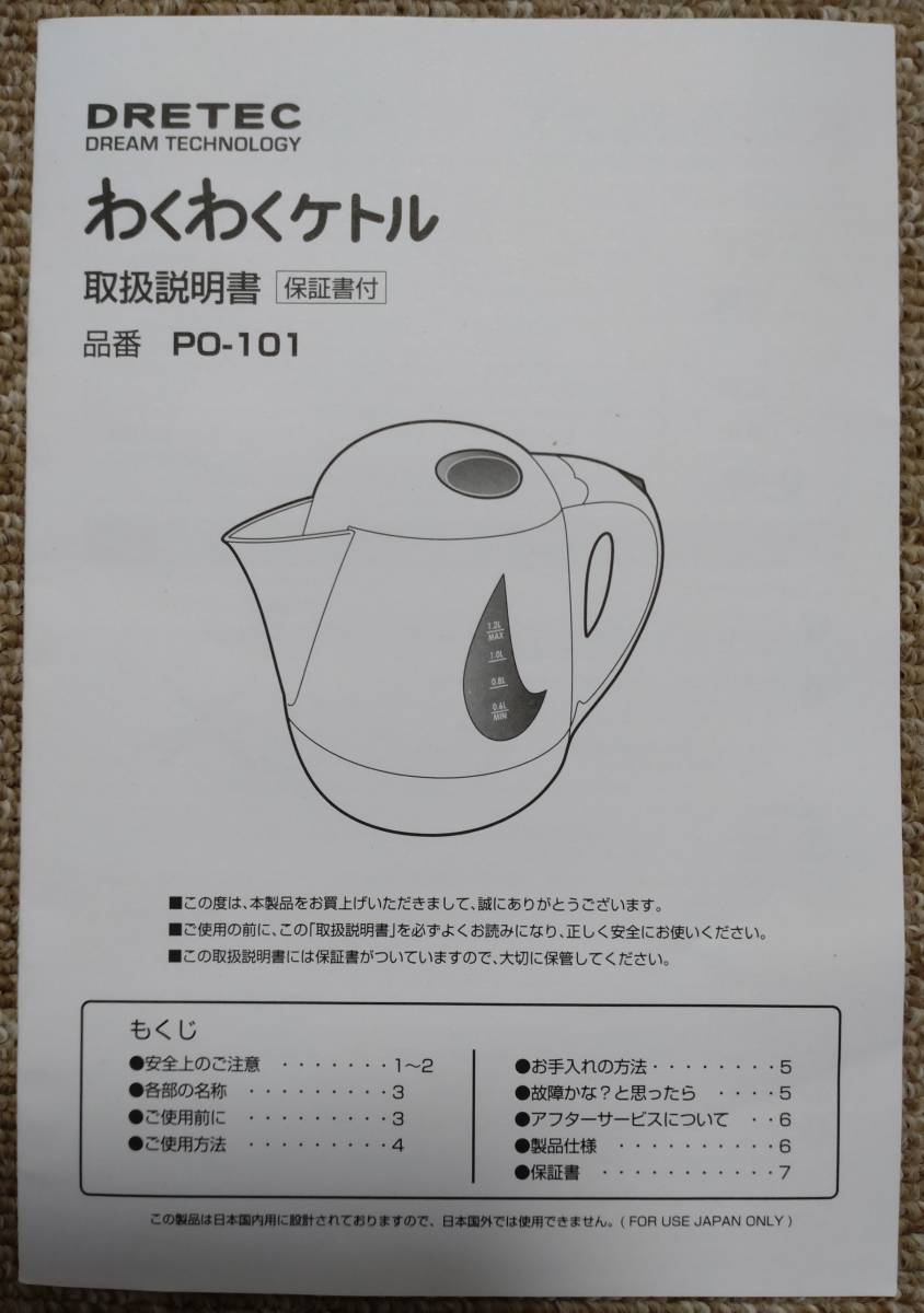 - 【中古】取扱説明書 DRETEC 電気ケトル わくわくケトル PO-101