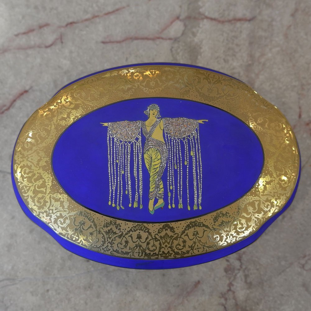 - 【黄金の宝石箱】アールデコ装飾置物女性ダンスジュエリーボックス小物入れリモージュ磁器金彩ブルーインテリアフランスパリ