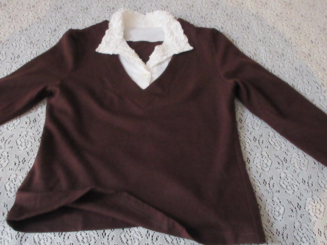 - L)■日本製■【M-collection】■茶伸縮ソフト毛100%&白ピコフリル襟/綿95%■1枚で2枚分!シャツ付き着痩せデザイン!セーター