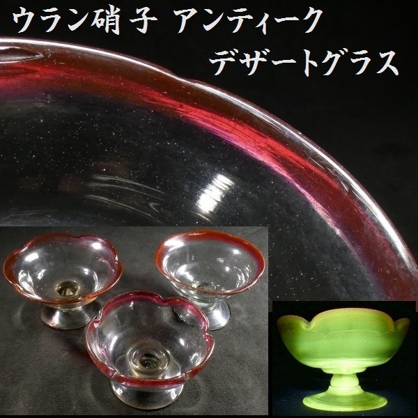 - 【 恵 #0764 】 ウラン硝子使用 アンティーク 輪花型 桃色ガラス 氷コップ デザートグラス 3点セット 検:鉢/古ガラス/氷コップ/色ガラス/
