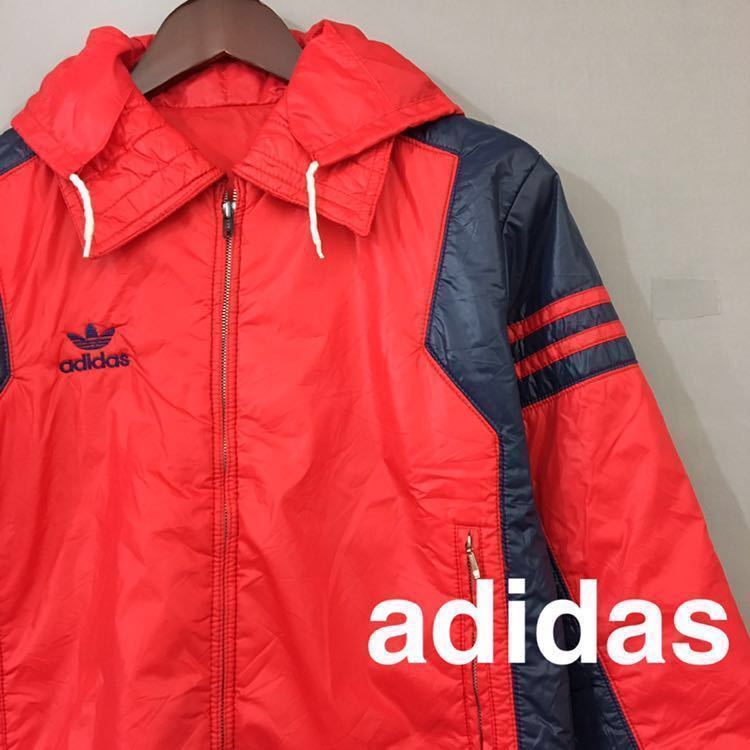 - 【希少・レア】【ビンテージ】アディダス adidas 70s 80s ナイロンジャケット 中綿 ロゴ刺繍 長袖 レッド ネイビー フード 男性用 ♭□