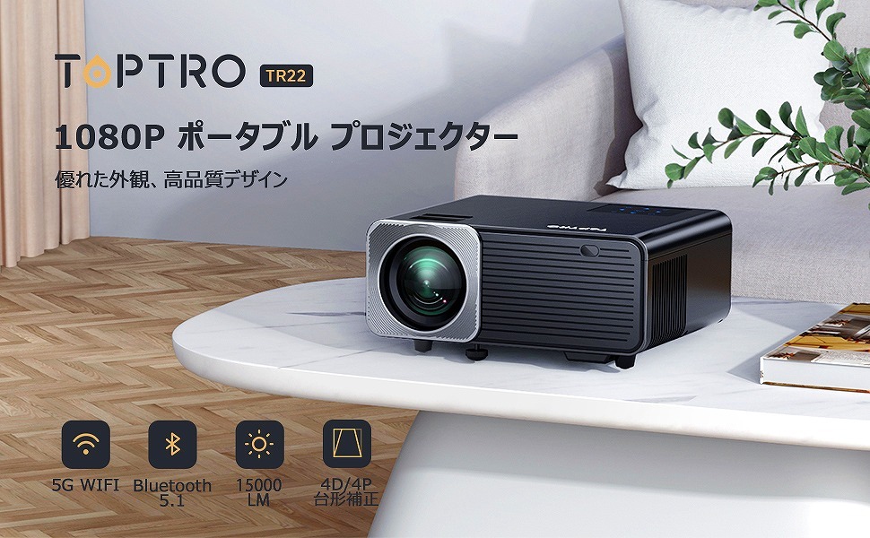 - 【新品】TOPTRO TR22 LEDプロジェクター フルHD iOS Android AirPlay Miracast Wi-Fi Bluetooth v5.1 HDMI USB 最大300インチ 5D台形補正