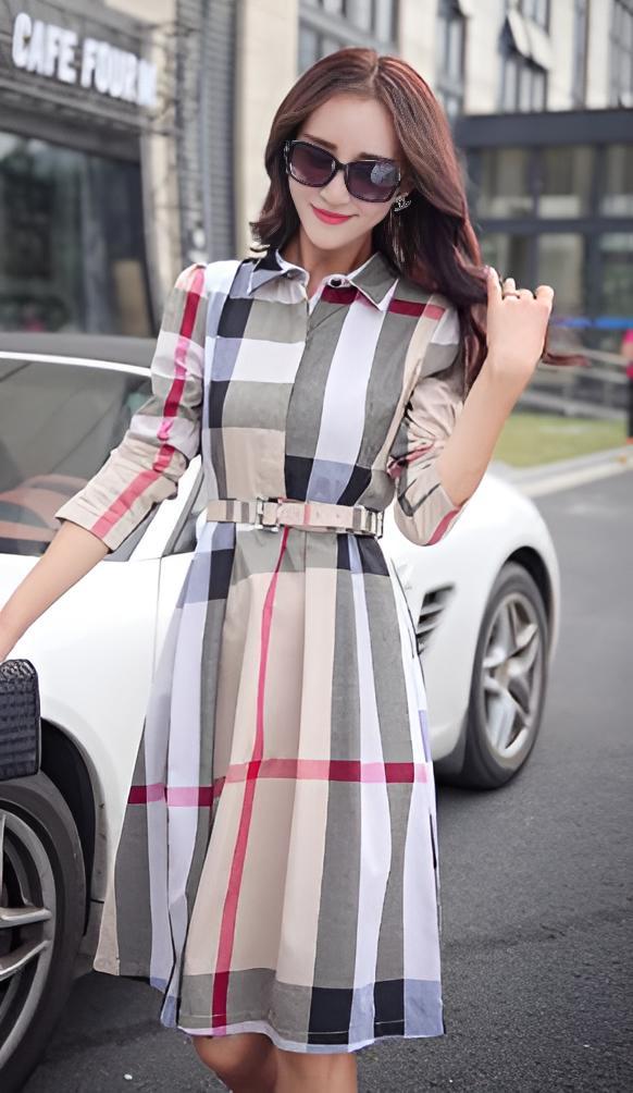 - 19-1.クラシカル チェックワンピ 長袖 ベルト付 ベージュ ミモレ丈 M