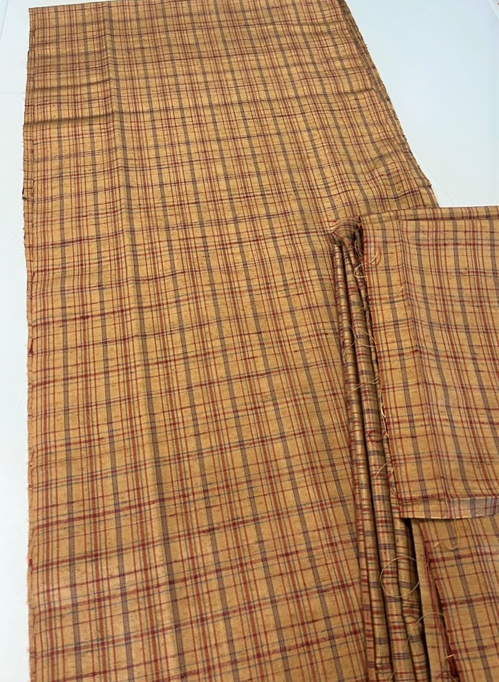 - 花とら●リサイクル生地 紬 格子 黄土色 リメイク 素材 細工用 端切れ 布地 230904
