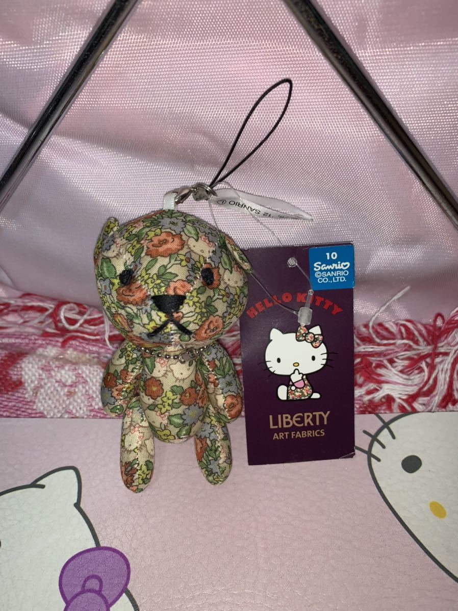 - リバティ×ハローキティコラボ生地で作られた、ベアマスコットぬいぐるみストラップ