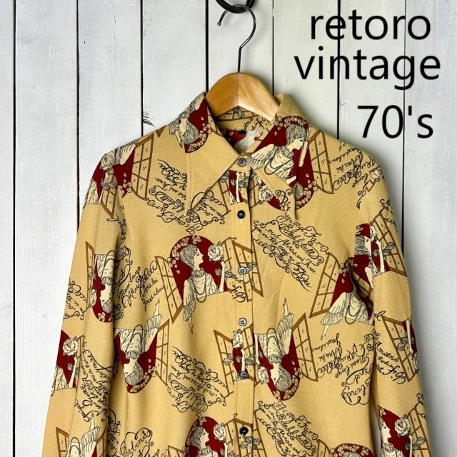 - sh●621 昭和レトロ古着 70s レトロ人物柄ブラウス M程度 ベージュ オールド ヴィンテージ デッドストック 70年代 総柄 日本製 ポリシャツ