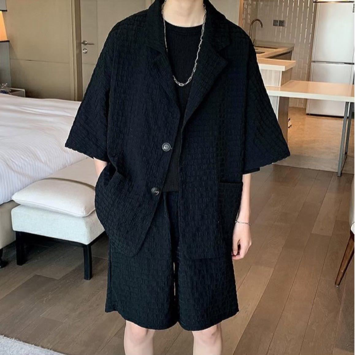 - セットアップ ジャケット パンツ 2点セット 部屋着 ワッフル ルームウェアジャケパン 上下セット ショートパンツ ユニセックス 黒 XL
