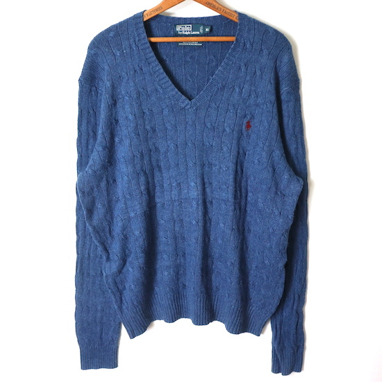 > 90s Polo by Ralph Lauren ラルフローレン インディゴ染め Vネック ケーブルニット(メンズ XL)インディゴ