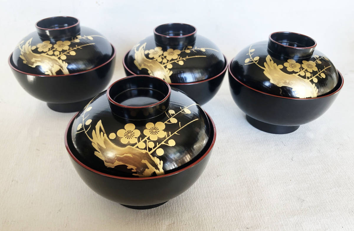 - 吸物椀 漆器 梅蒔絵 丸型 黒塗 4客 在庫整理 雑煮椀 おせち