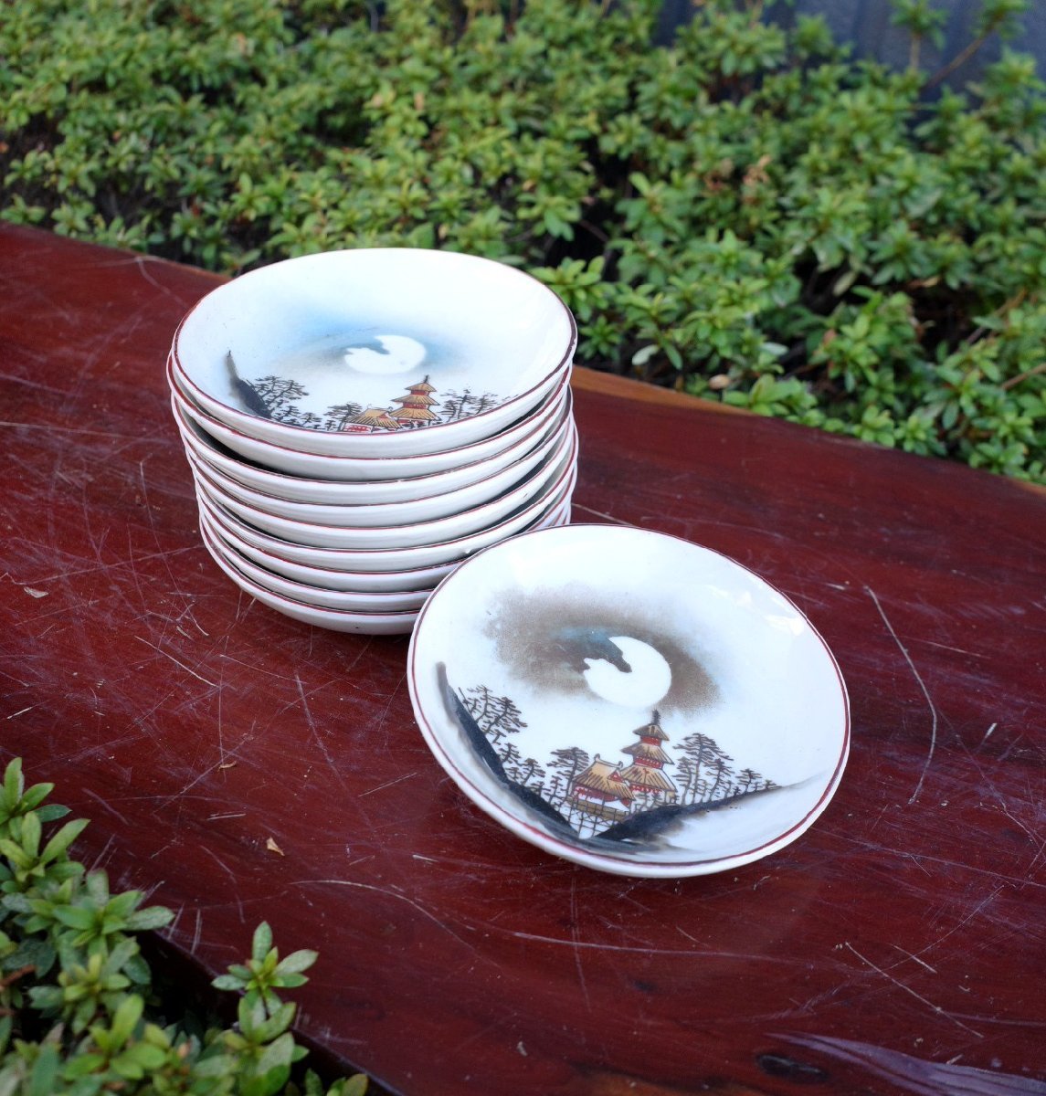 > ○可愛い三重の塔と月の絵 陶器の小皿 10点セット 印判? レトロ 和モダン 昭和 古民家 ヴィンテージ 古道具のgplus広島 2311i