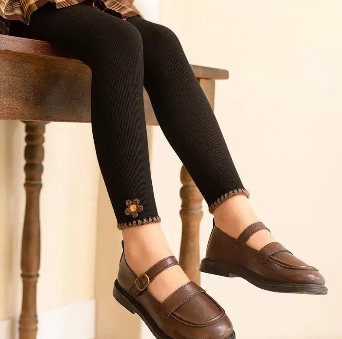 - かわいい花柄 ワッフルコットン 子供用レギンス キッズ 女の子 ブラック 150