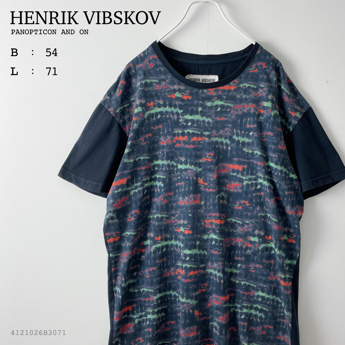 > HENRIK VIBSKOV メンズ L 相当 アート 総柄 プリント 半袖 Tシャツ 紺 ネイビー マルチカラー 切り替え 綿 100% ヘンリックヴィブスコフ M