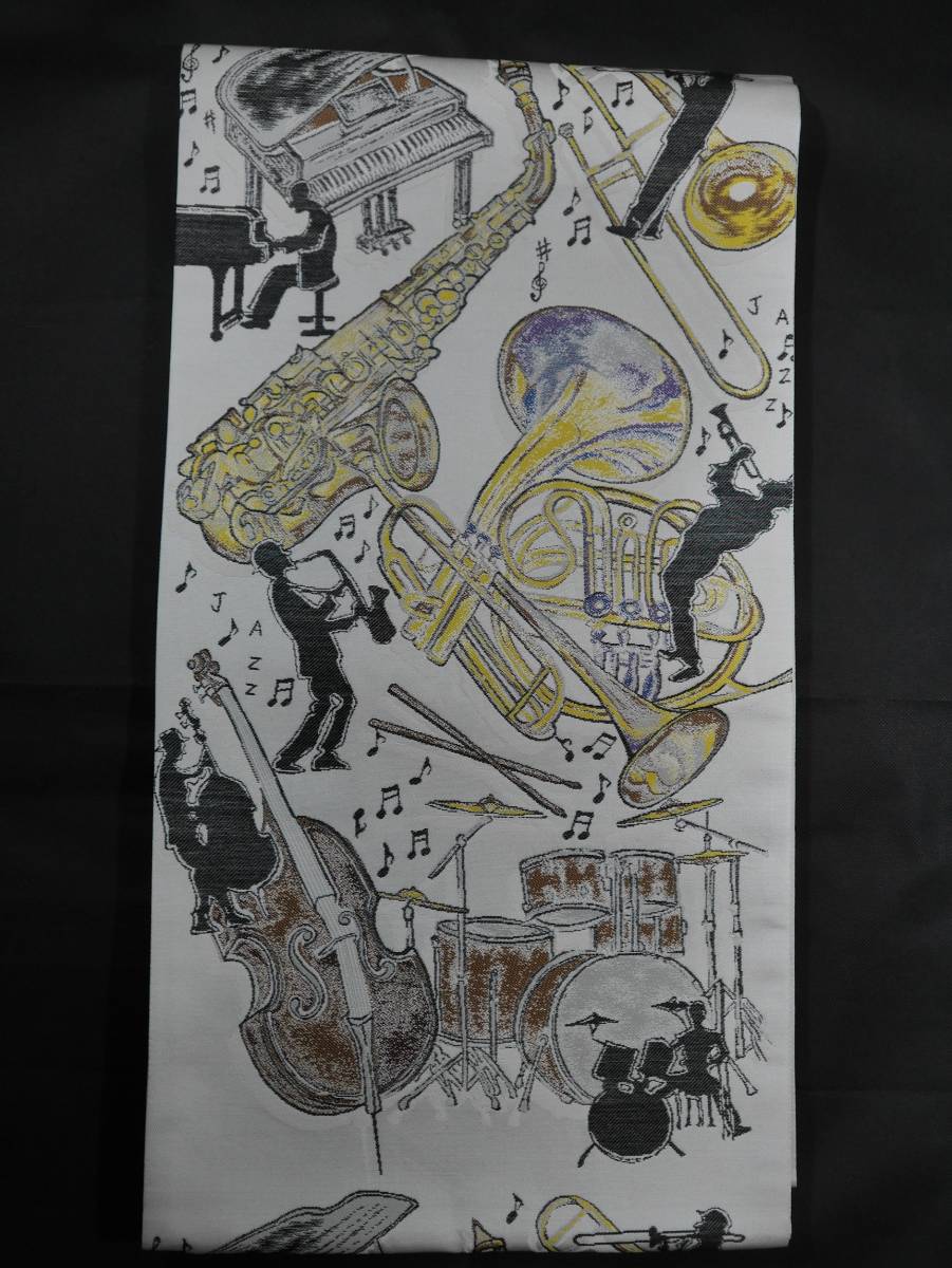 - 未仕立て新品 西陣織最高級袋帯 ジャズを奏でる 六通総柄 白グレー地色 正絹 お仕立て代込み 送料無料