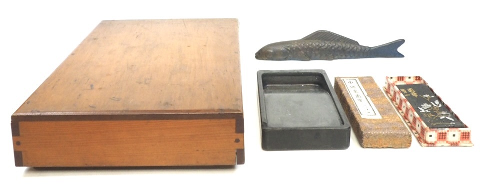 - 使い込まれた味わいとレトロな雰囲気の逸品!昭和中期ビンテージ 書道具セット 文箱 硯 墨 魚形文鎮 古道具 1950年代 CKY512