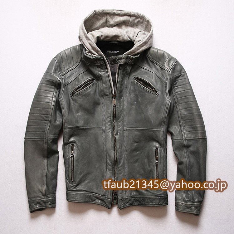 - レザージャケット メンズ ハレージャケット フード付き バイクジャケット 高級 柔らかい羊革 本革 革ジャン M~XLグレー
