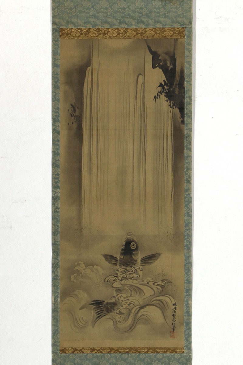 - 【真作 江戸動物画】掛軸「狩野晴川院 瀑布昇鯉図」江戸後期 狩野派 木挽町狩野家九代 江戸幕府奥絵師 絵画