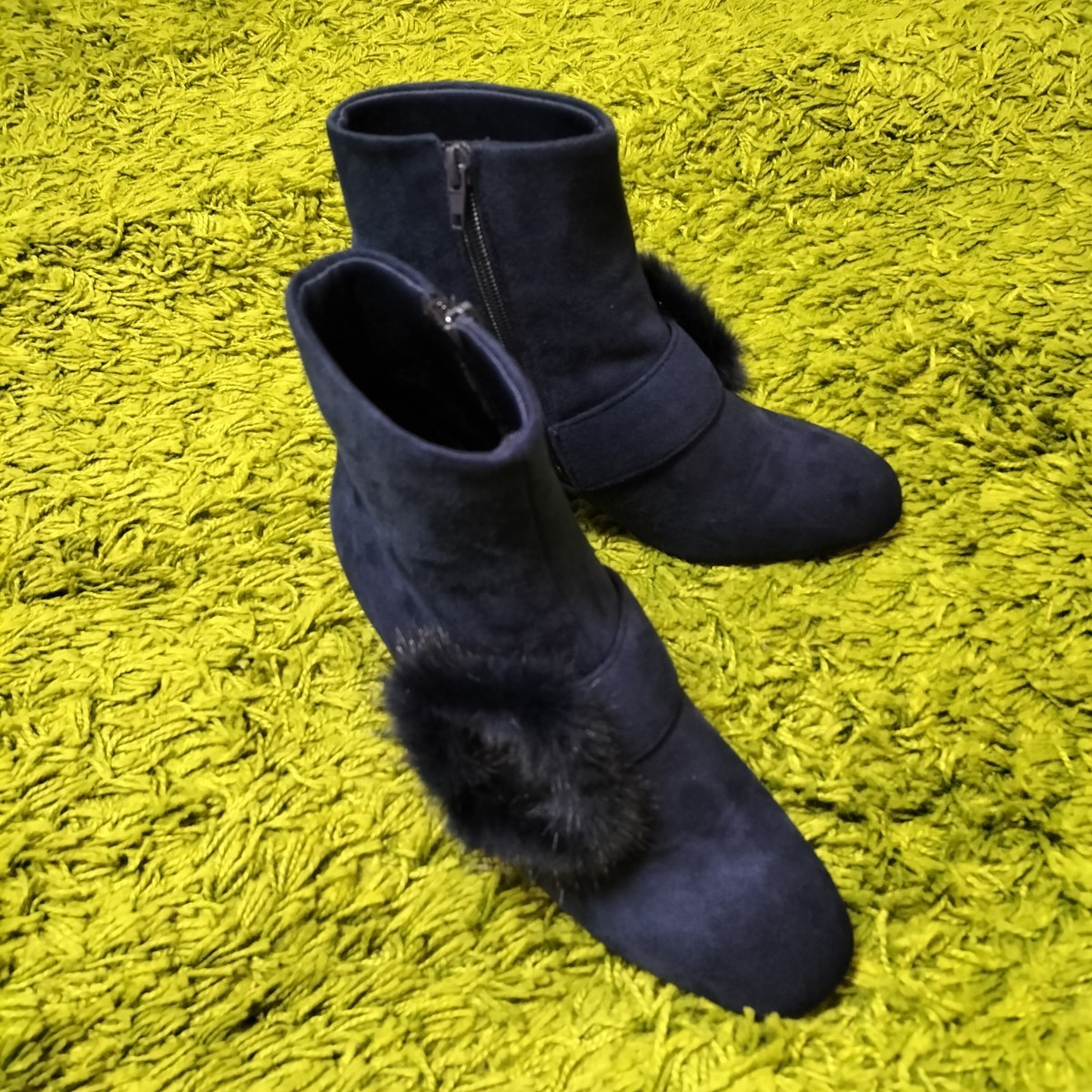 - 美品★RANDA ブーティー ショートブーツ サイドジップ ミドルヒール スウェード ファー ネイビー 表記サイズM 23〜23.5cm ランダ 靴 USED