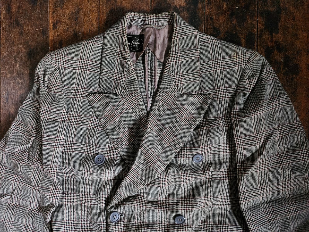 - 新品 ★ ダブル ブレスト テーラー ジャケット グレー ブラック 千鳥 格子 ブロック チェック ラペルド ビンテージ ブレザー サック コート