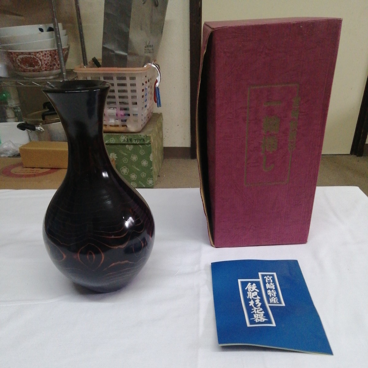 - 宮崎 飫肥杉 おびすぎ 一輪挿し 木目 伊藤藩 伊東ロクロ工芸 箱付 花器 花瓶 天然 銅 箱入 (約高24.5cm)