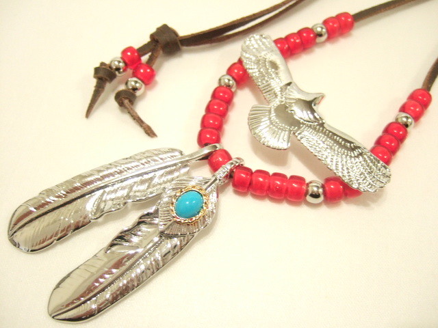 > 横浜最新 イーグル鷲♪魅惑のレッドビーズイーグルフェザーネックレス レザーネック70cm メンズレディース送料無料ξbalnξξネックレス28