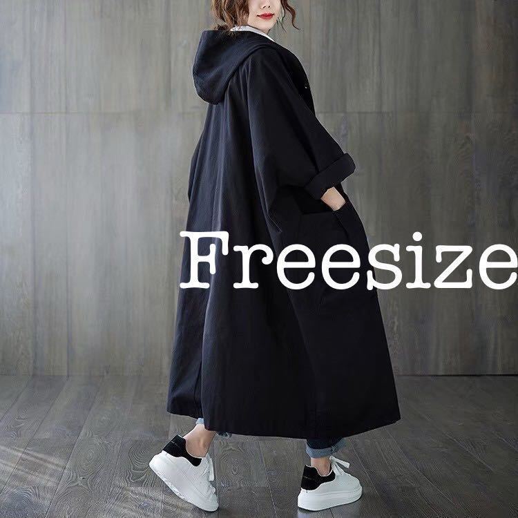 - ロングコート パーカー コート フード シングルトレンチ アウター ビッグシルエット マタニティ ブラック 黒 フリーサイズ