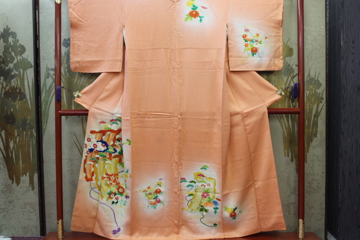 > きもの今昔6339 付け下げ訪問着 広衿袷手縫い仕立て 正絹霜降り綸子地 橙色中ボカシ几帳柄友禅 身丈152cm