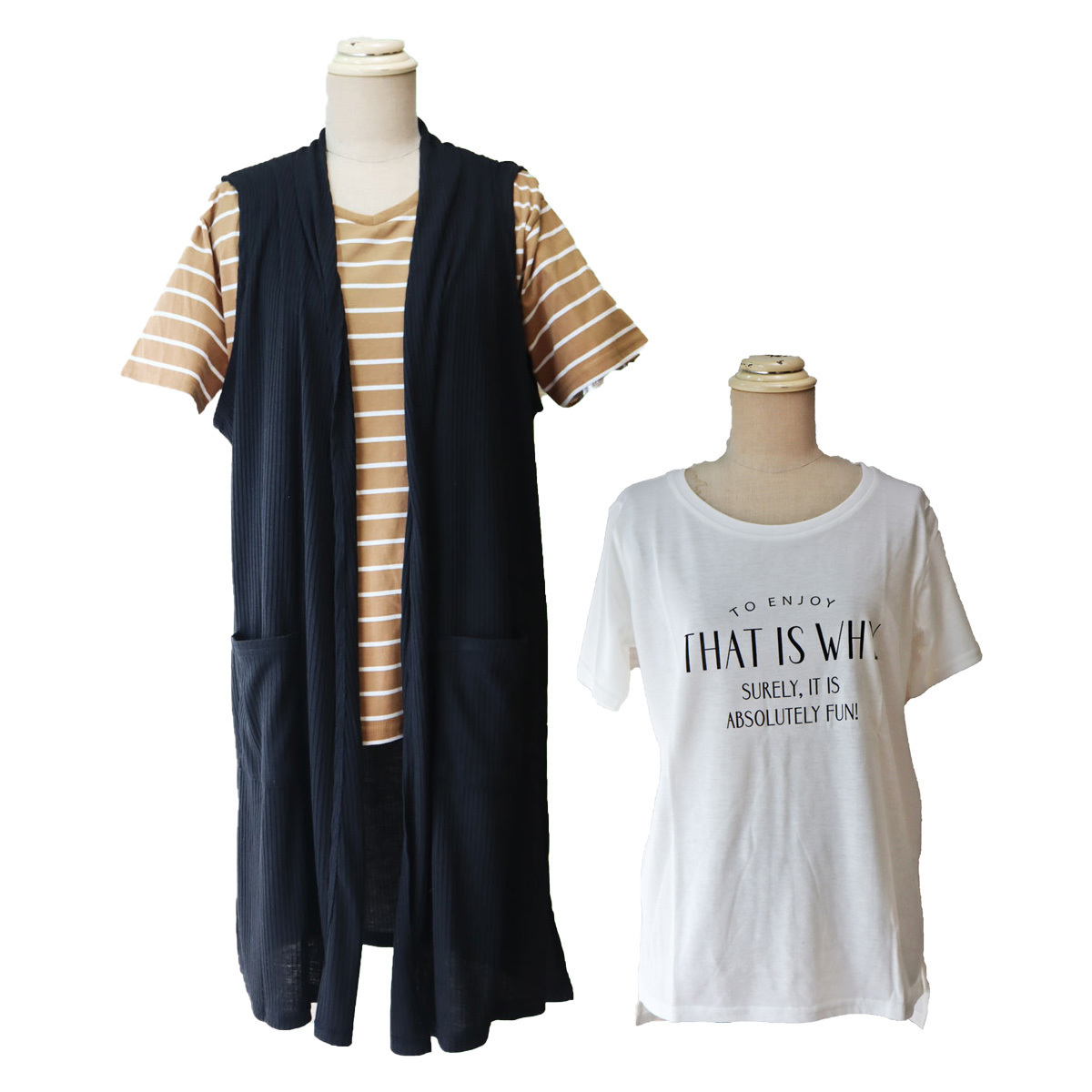 - han124 アンサンブル 3点セット ロングベスト&半袖Tシャツ2枚 黒&白&茶 Mサイズ レディースファッション 夏