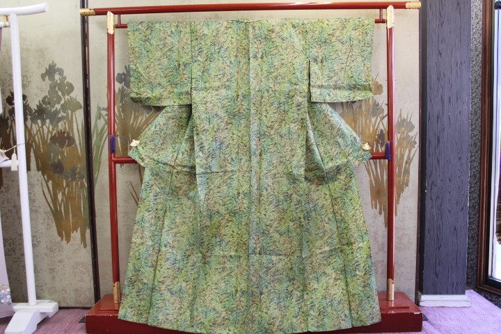 > きもの今昔6404 単衣のきもの 広衿セブセ付き手縫い仕立て 正絹染大島調 緑主体立木柄 身丈161cm
