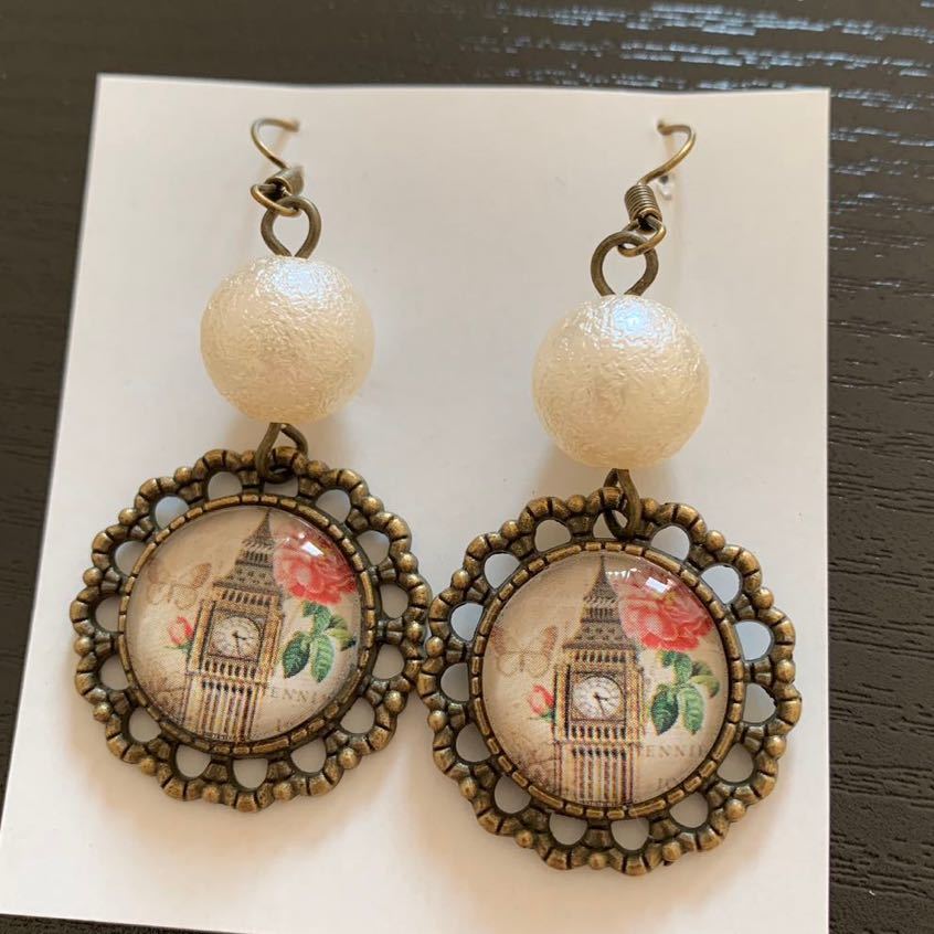 - レトロ 時計台 ローズ フェイクコットンパール ピアス アンティークゴールド