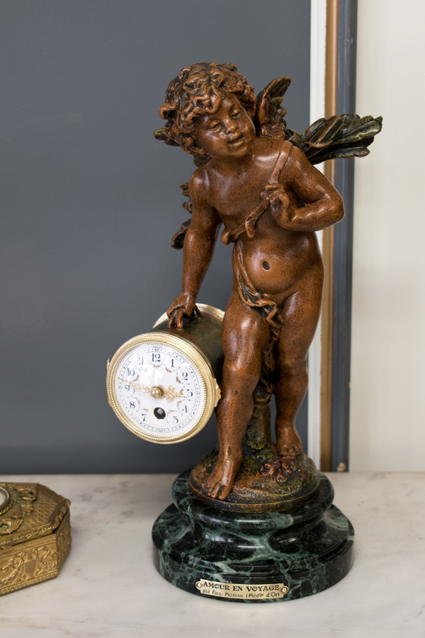 クピドーが持つ旅行鞄が時計になっているという とても遊び心あるデザインで、時計板には手書きの細かな花模様。美しい時計の針も、綺麗に磨きなおすことで本当に細かいそのデザインが より繊細にはっきり楽しめるようになりました。